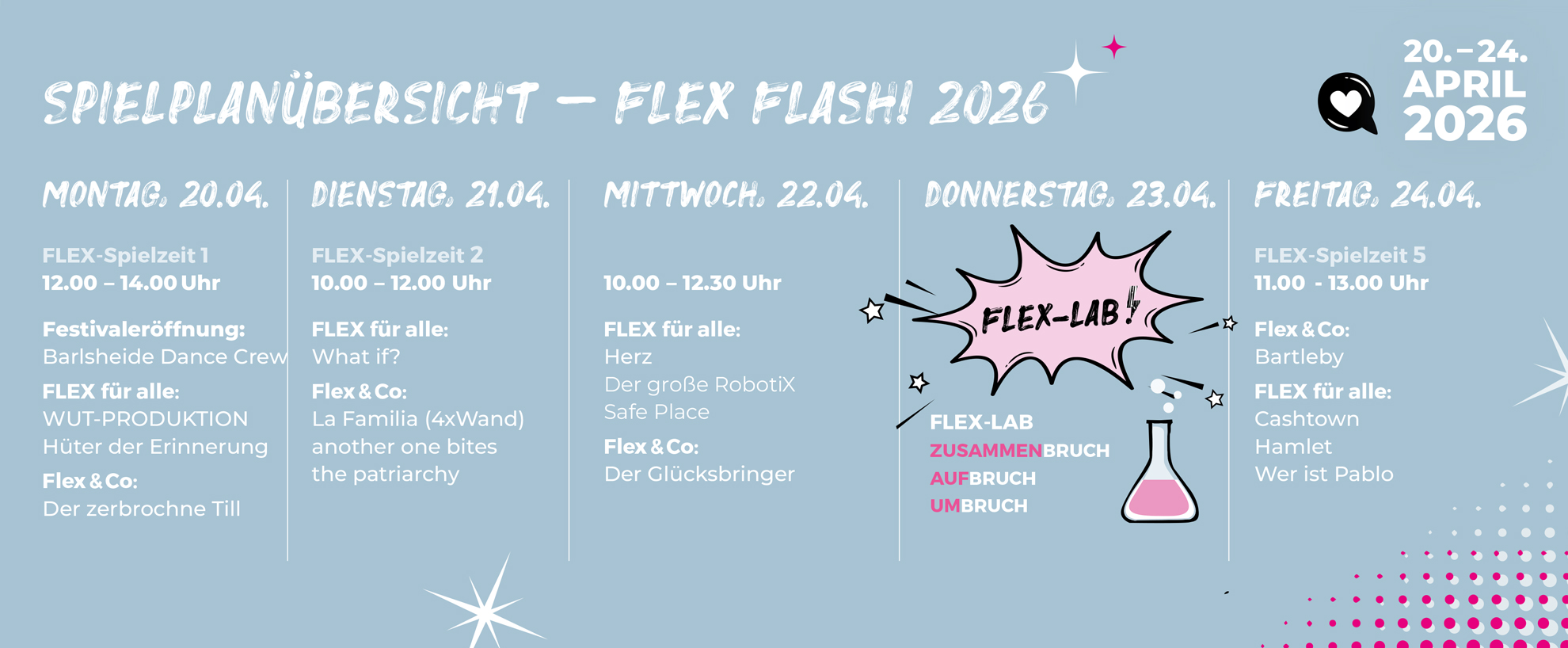 In den 5 „FLEX & Co.“ – Produktionen haben ausgewählte Gruppen innerhalb einer Jahresproduktion mit Künstler:innen kooperiert, die Kategorie „FLEX für alle“ ist die offene Bühne für vorab jurierte Schultheaterkurse, die ihre Produktionen oder Ausschnitte davon zeigen.